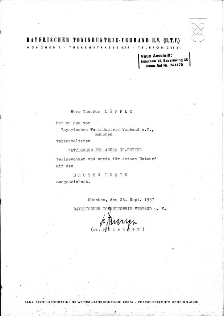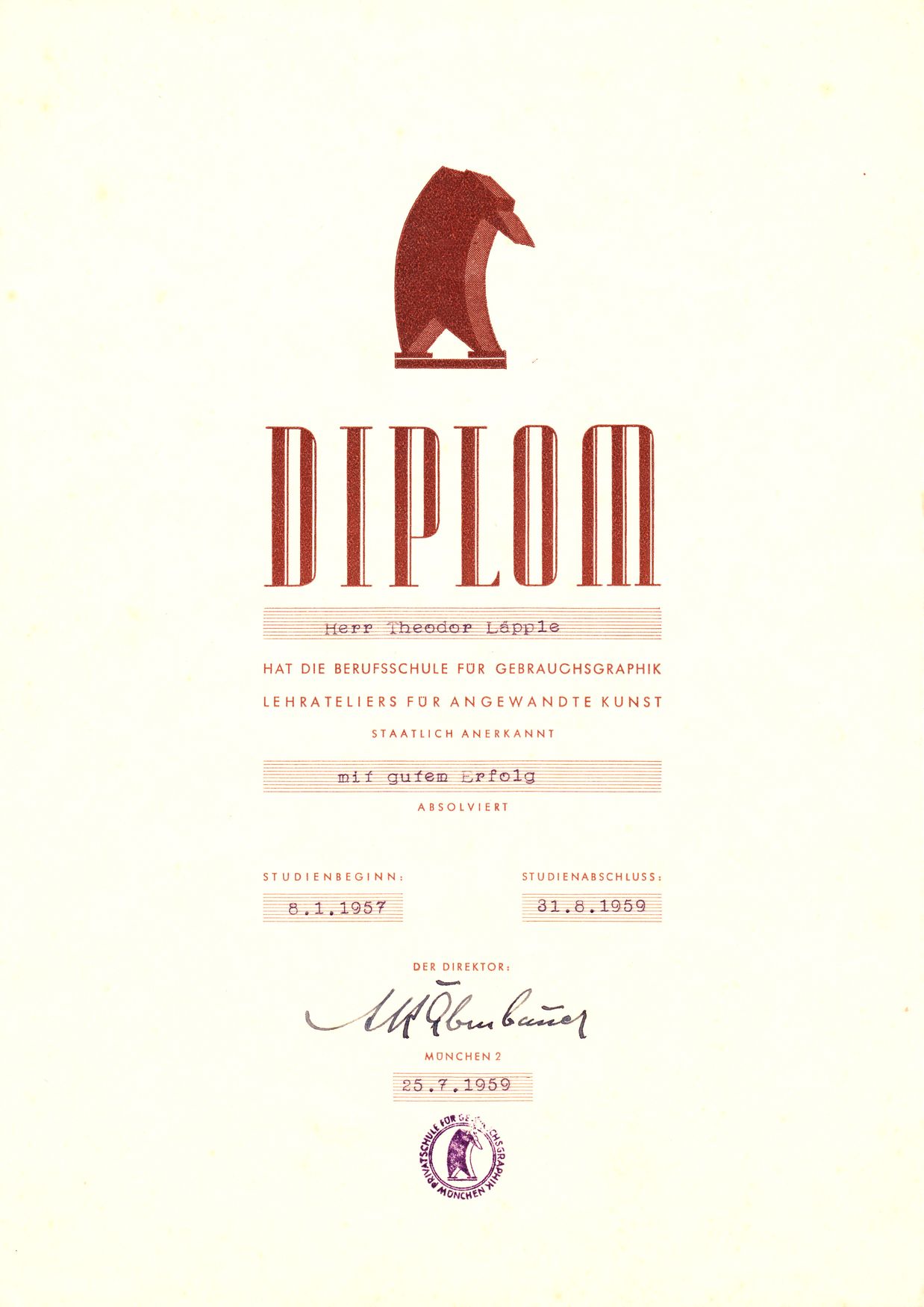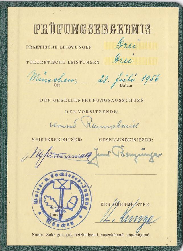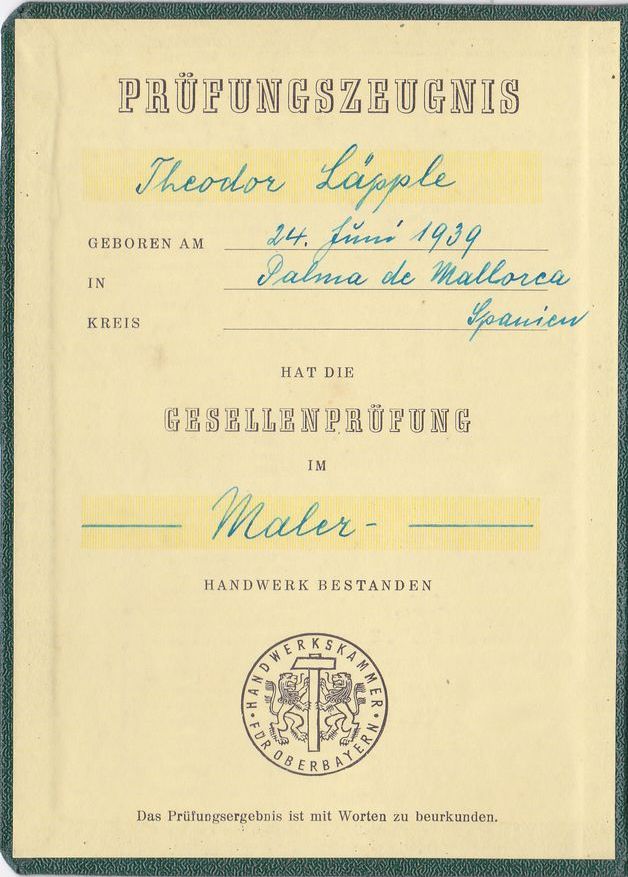 Bei Malermeister Willy Ernst in Grafin bei München erlernte Theodor Läpple von 18.07.1953 bis 17.07.1956 das Malerhandwerk. Dies schloß er am 28.07.1956 mit dem Gesellenbrief ab.